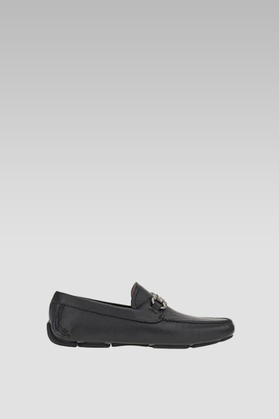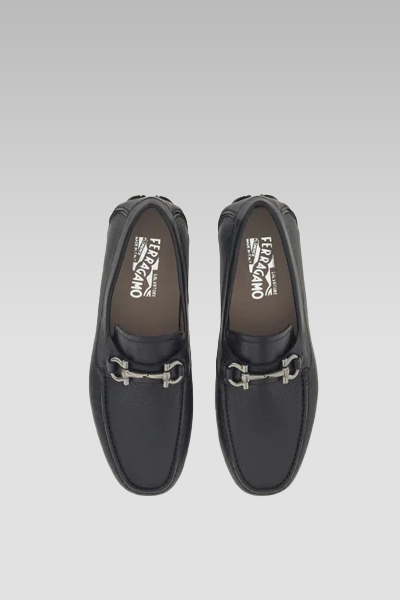 Introducing the Ferragamo Driver Black, a perfect blend of elegance and comfort. Crafted from premium hammered calfskin leather, these driving shoes feature a stunning two-tone effect that enhances their sophisticated appeal. The iconic gunmetal Gancini bit adds a touch of luxury, while the personalized rubber sole ensures optimal grip for casual outings. Designed with exquisite tubular construction, these shoes offer a soft and lightweight feel, making them perfect for all-day wear.