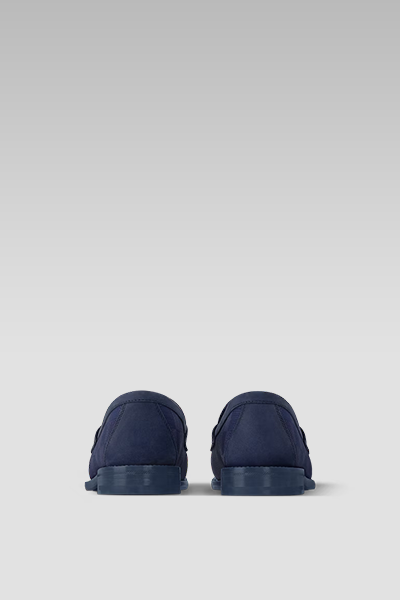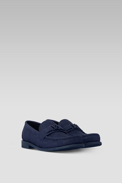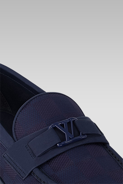 This edition of the LV Major Loafer in Marine blends luxury with timeless elegance. The Damier jacquard motif on fabric showcases Louis Vuitton's iconic pattern, while the glazed calf leather trim adds a touch of refinement. A hand-stitched vamp, completed in an hour, highlights the attention to detail. The loafer features a leather and rubber outsole for durability, and a padded insole for exceptional comfort. Finished with a silver-tone LV Initials accessory, this loafer is the epitome of style.