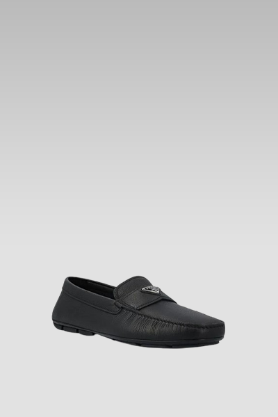 The Prada Saffiano Leather Loafer Driver with Enameled Metal Band Logo is a shoe designed for casual wear. It is made from high-quality black Saffiano leather, known for its durability and resistance to scratches and water. The shoe features a slip-on design with a rubber sole that provides excellent driving grip and traction.