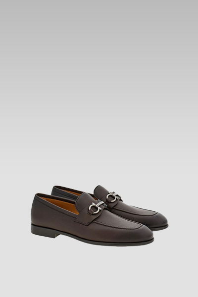 Introducing the Ferragamo Gancini Loafer in Brown, where elegance meets versatility. These elongated loafers are crafted from luxurious soft calfskin, featuring a unique collapsible heel that allows them to be worn as mules. The exquisite stitched apron toe enhances the sophisticated design, while the signature golden Gancini accent adds a touch of glamour. With a comfortable 1 cm heel, these loafers provide all-day wearability. Made in Italy, the Ferragamo Gancini Loafer seamlessly combines style and comfort, making it an essential addition to your shoe collection.