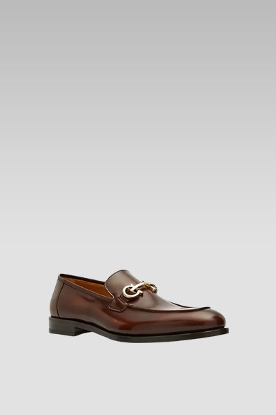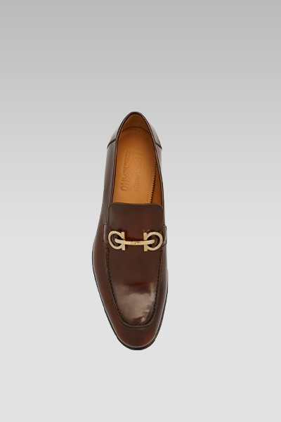 These are the Ferragamo “Gustav” loafers, made from smooth calf leather with a gold-tone Gancini-bit. They have a stacked heel, elongated round toe, notched vamp, and leather lining. They are made in Italy using top-quality materials.