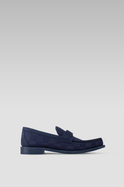 This edition of the LV Major Loafer in Marine blends luxury with timeless elegance. The Damier jacquard motif on fabric showcases Louis Vuitton's iconic pattern, while the glazed calf leather trim adds a touch of refinement. A hand-stitched vamp, completed in an hour, highlights the attention to detail. The loafer features a leather and rubber outsole for durability, and a padded insole for exceptional comfort. Finished with a silver-tone LV Initials accessory, this loafer is the epitome of style.