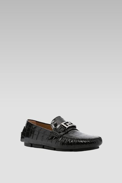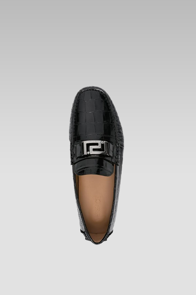 This luxe and sophisticated pair of loafers features a Versace logo plaque and a crocodile effect. Crafted from exquisite Calf Leather with a distinguished Crocodile effect, these loafers exude opulence and style. The iconic Versace logo plaque adorns the vamp, adding a touch of designer flair. Perfect for the modern gentleman, these black loafers seamlessly blend timeless elegance with contemporary fashion. Step out in confidence and elevate your ensemble with this impeccable fusion of craftsmanship and refinement.