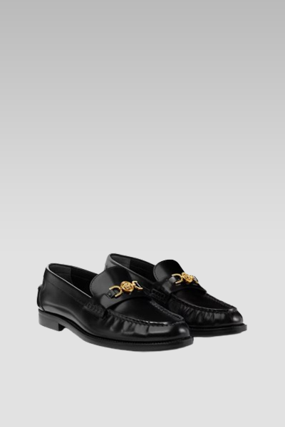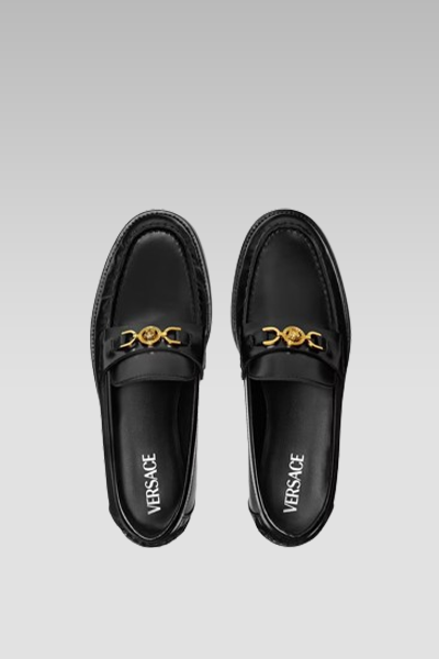 These leather loafers are designed with a polished finish and feature the Medusa ’95 detail at the penny strap. This hardware is a distinctive emblem of the brand that was first introduced in the mid-1990s. The shoes are designed with a slip-on style, round toe, penny strap, and flat stacked heel. The outer composition is made of 100% Calf leather, while the first lining is made of 100% Lambskin and the second lining is made of 100% Goat leather. The sole is crafted from 100% Calf leather.
